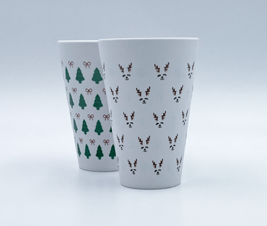 Our in-house lathe printer can print your design around the full 360° surface of these cups. Print full colour high-definition wraparound designs on a white or black cup.